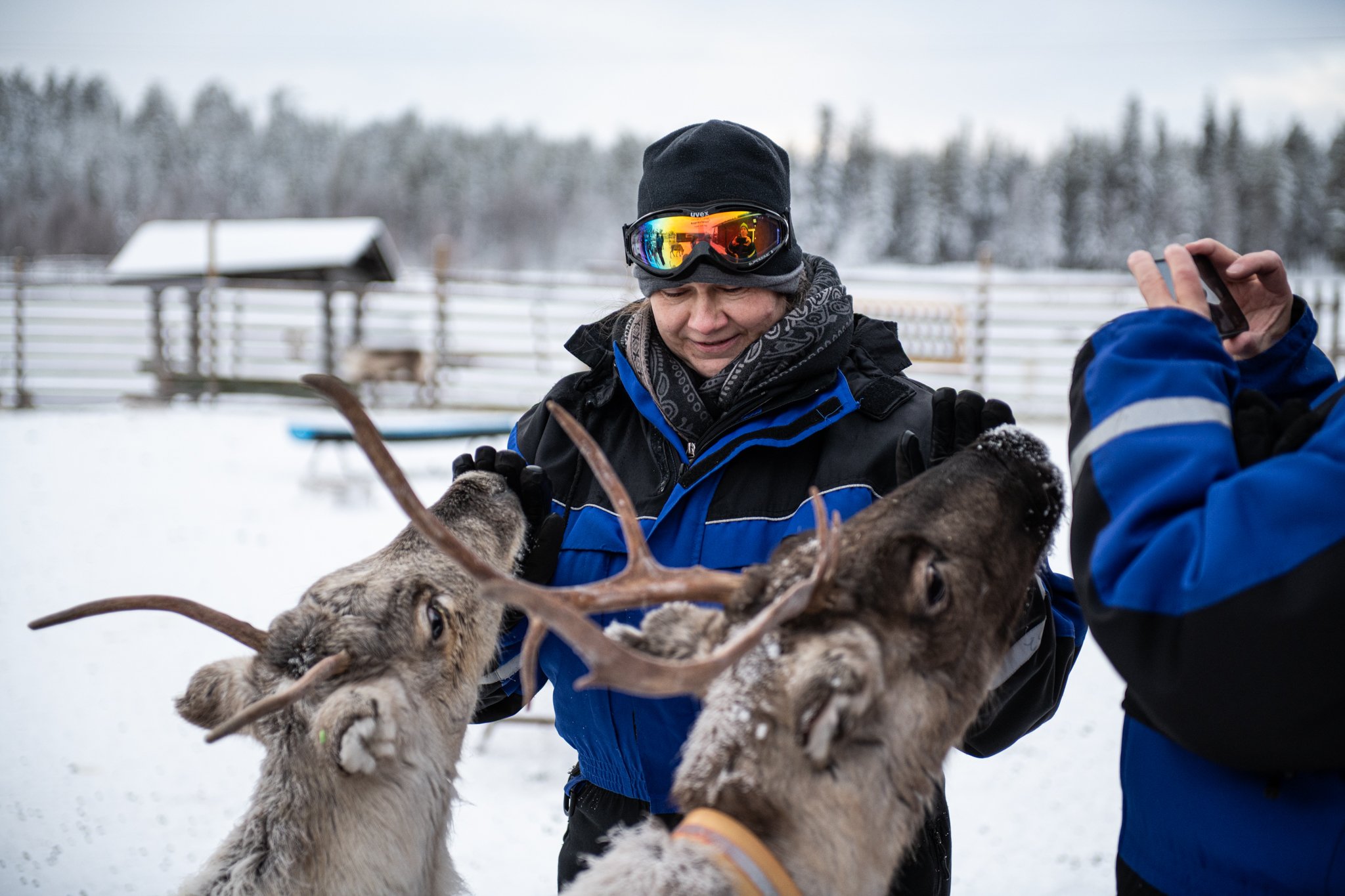 Visit the friendly reindeers with us. We drive by snowmobile through the beautiful winter landscape. The route is varied and leads through snow-covered forests and endless frozen swamps to a local reindeer farm. Many friendly reindeers are waiting there to be petted and fed by you. Experience these magnificent and curious animals up close, they are even willing to take selfies with you for a snack. Over snacks and a cup of hot drink indoors. After the break, you return to Levi on a snowmobile.
