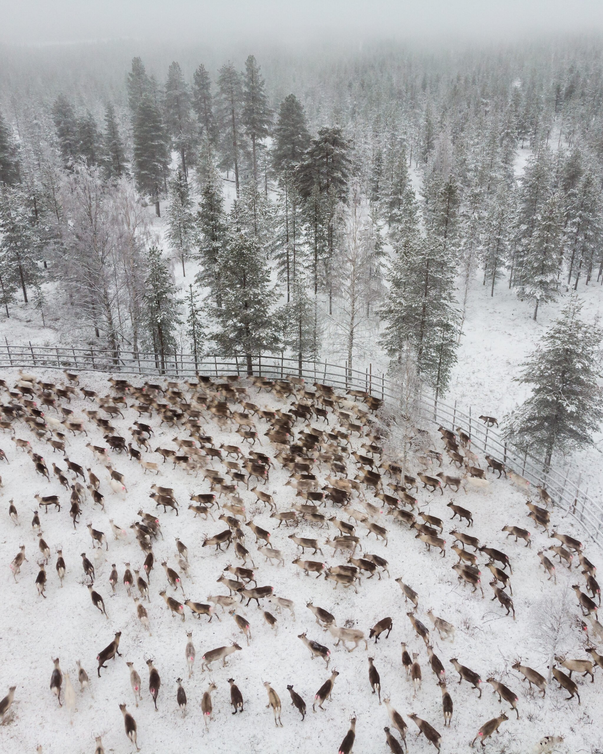 In the wilderness, near Olos and Pallas, you’ll see reindeer pastures with hundreds of reindeer and their herders. You will learn about modern reindeer care, feeding, and their yearly cycle. Sitting in a snowmobile-pulled sledge, you'll have the chance to watch a large herd of reindeer in their natural environment, perfect for taking photos.
