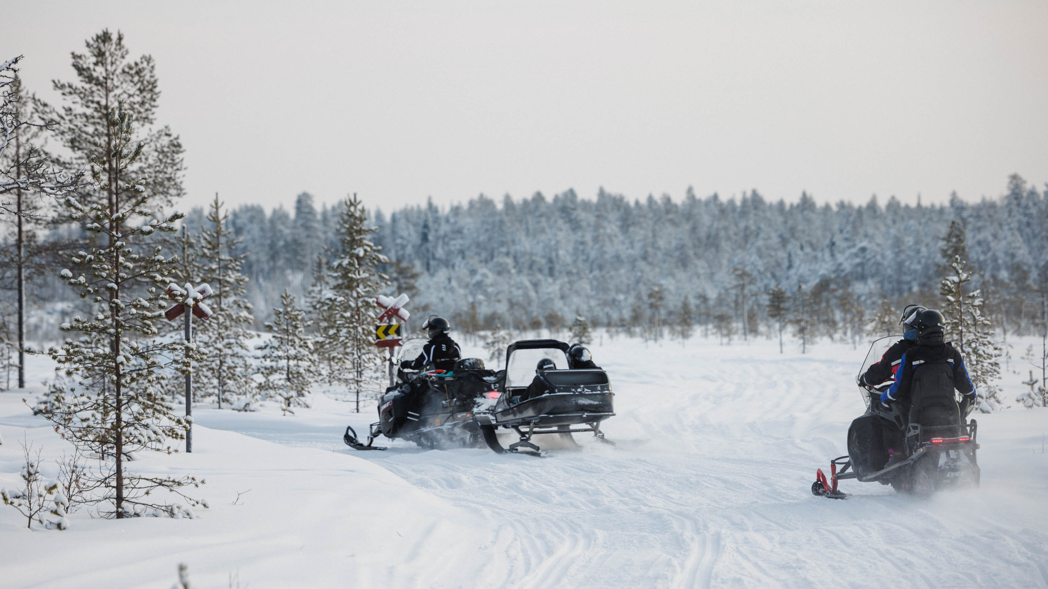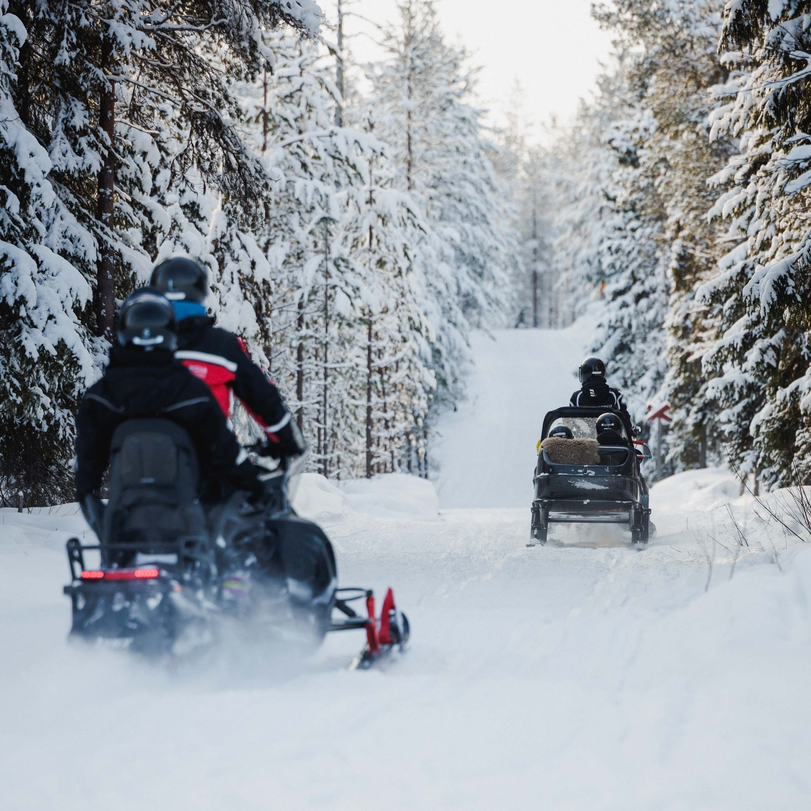 Upon arrival at our safari office, you will be equipped with thermal and safety gear before embarking on the first departure, with adults sharing an adult-size snowmobile and children seated in a sledge pulled by the guide's snowmobile. Enjoy a one-hour long tour led by your guide through the forest trails and frozen swamps. Upon arriving back to the safari office it will be children's turn to drive on the mini snowmobile track for 10 minutes while parents can capture the moment.